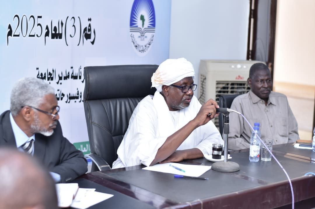 انعقد اليوم الإثنين الأول من ديسمبر 2025م، بمقر جامعة إفريقيا العالمية اجتماع مجلس المدير الاستشاري رقم (3)، وهو أول اجتماع يُعقد داخل الجامعة منذ اندلاع الحرب التي شنتها مليشيا الدعم السريع على الدولة السودانية. وترأس الاجتماع مدير الجامعة البروفيسور حاتم عثمان محمد خير، وذلك بحضور نائبي المدير : الدكتور محمد عثمان نائب المدير للشؤون العلمية والثقافية، والبروفيسور يوسف خميس أبو رفاس نائب المدير للشؤون الإدارية والمالية المكلف، إلى جانب عمداء الكليات ومديري الإدارات والمراكز والوحدات العلمية.